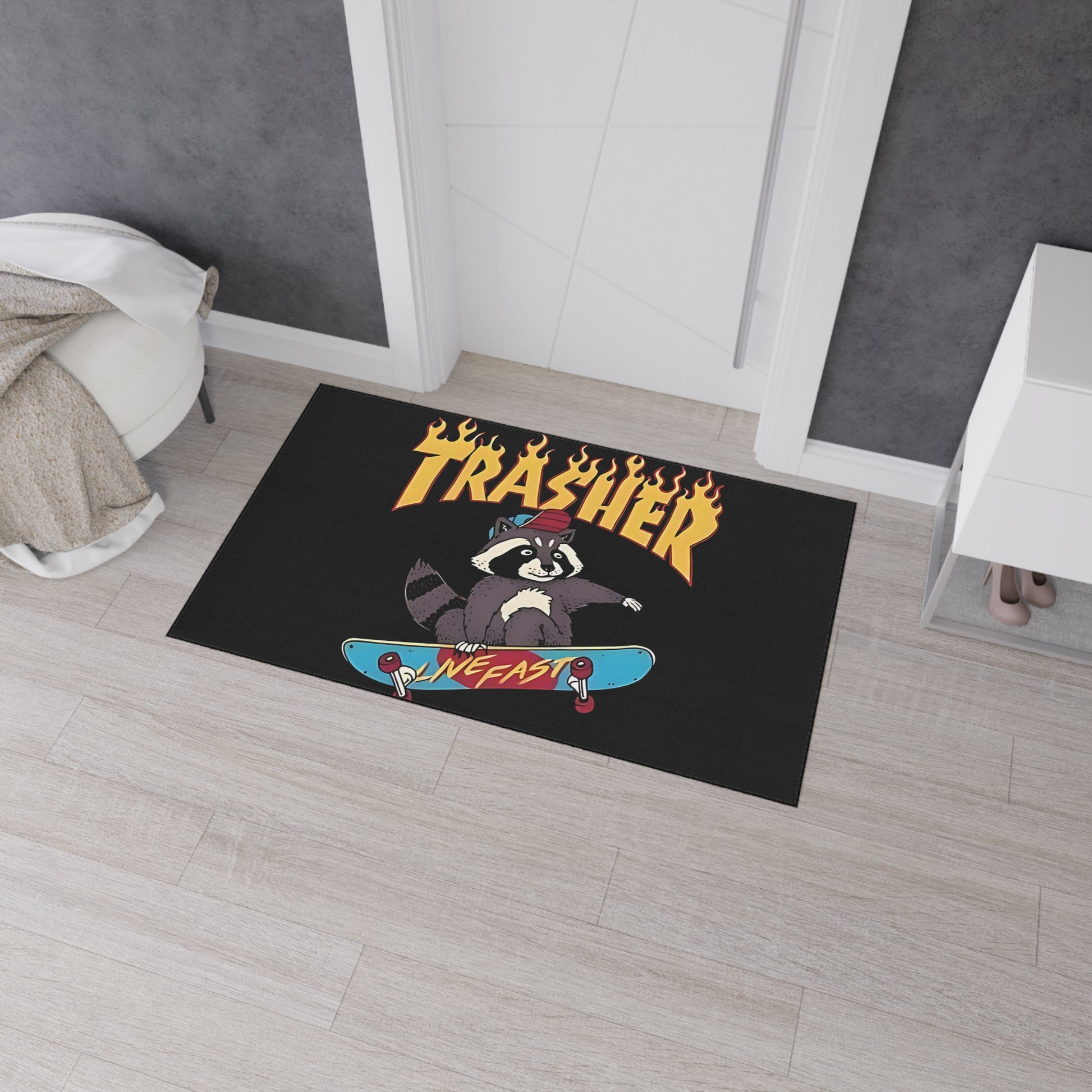 Skate Raccoon 'Trasher' Heavy Duty Floor Mat, Live Fast Skateboard Entrance Rug