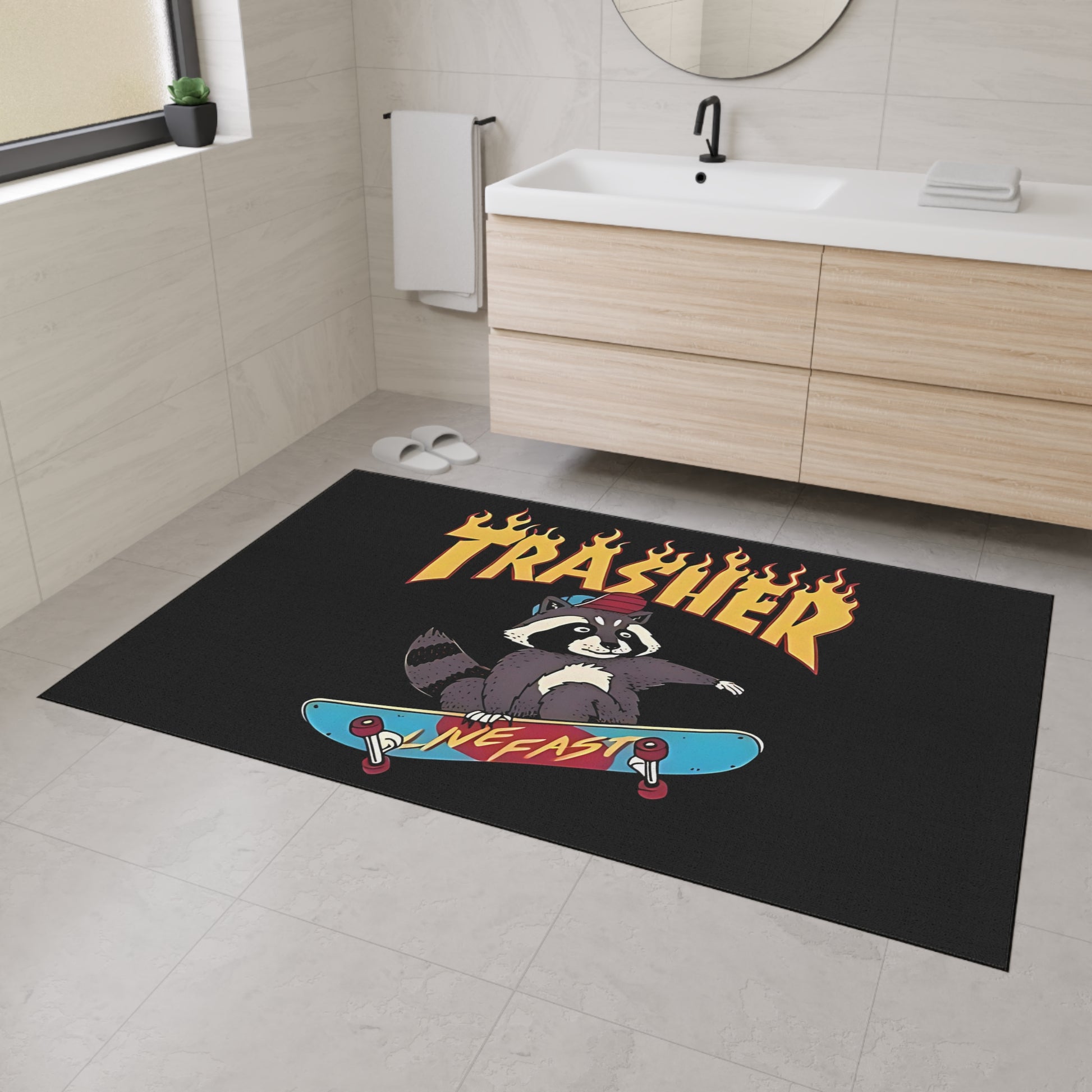 Bring playful skate-punk energy to any entryway or room with this heavy-duty floor mat. A mischievous raccoon mid-trick rides a brightly colored deck beneath bold, flame-tipped lettering — all printed on a deep black background that makes the artwork pop. The durable polyester surface holds crisp, vibrant inks while the textured rubber backing grips floors so the mat stays where you lay it down. It wears well through foot traffic, keeps dirt and grit contained, and adds a wink of personality whether you place it by the door, at a studio bench, or under a record player. Assembled in the USA from globally sourced parts, the mat combines streetwise style with practical performance for everyday life.