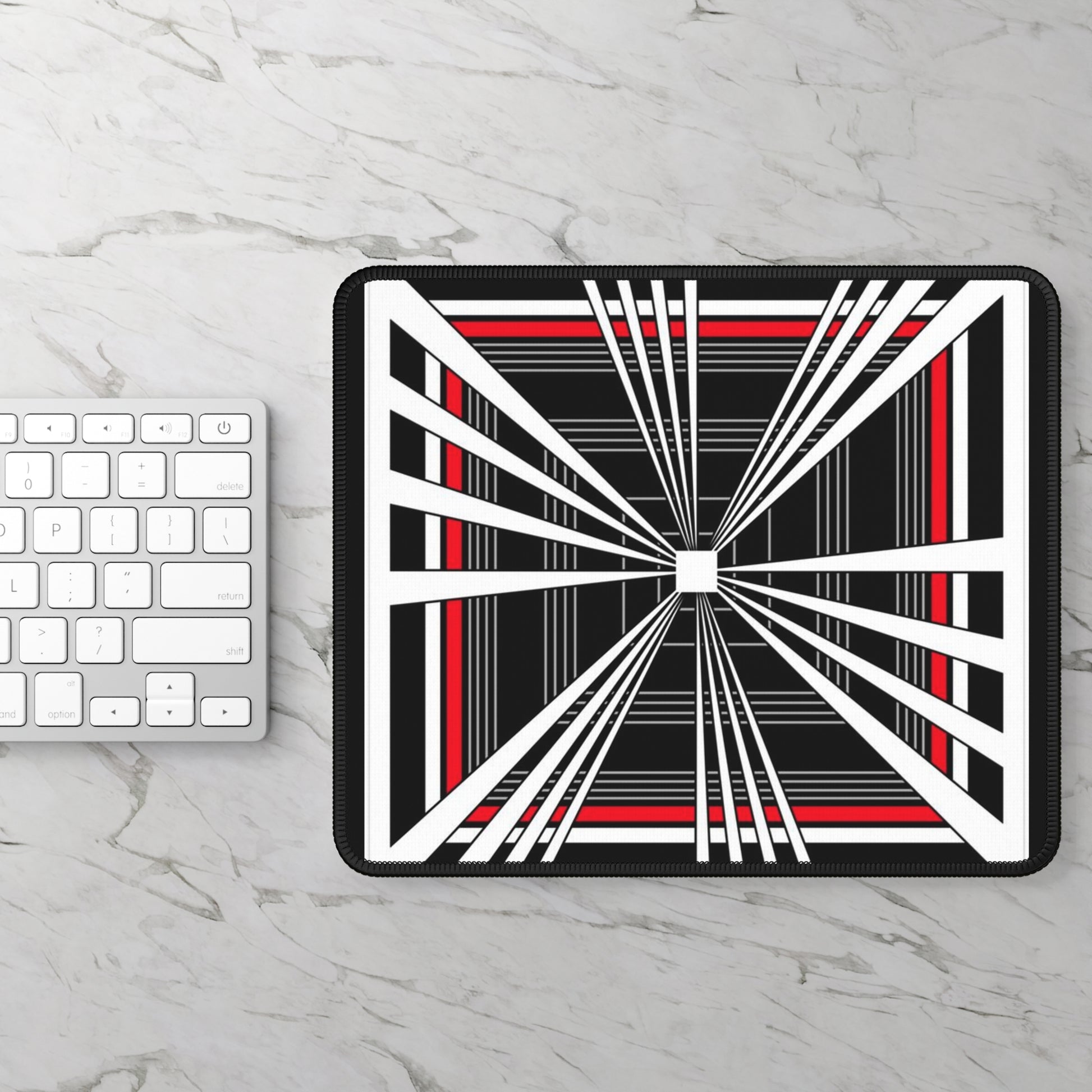 This gaming mouse pad brings focused energy to your desktop. Its bold optical pattern—sharp white beams against deep black with red accents—creates a sense of motion that guides your hand and sharpens concentration during play or work. The low-friction surface lets your mouse glide smoothly for precise tracking, while the rubberized base locks the pad in place so each swipe feels steady and controlled. Durable stitched edges keep the design intact through long sessions and frequent use. Compact and resilient, it slips into a small setup or accompanies you between desks, adding a striking visual anchor that feels both modern and intense.